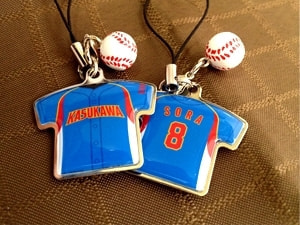 粕川フレンズ様からご注文いただきました商品です。ユニフォームストラップ。野球ボールフィギュア付きの商品です。